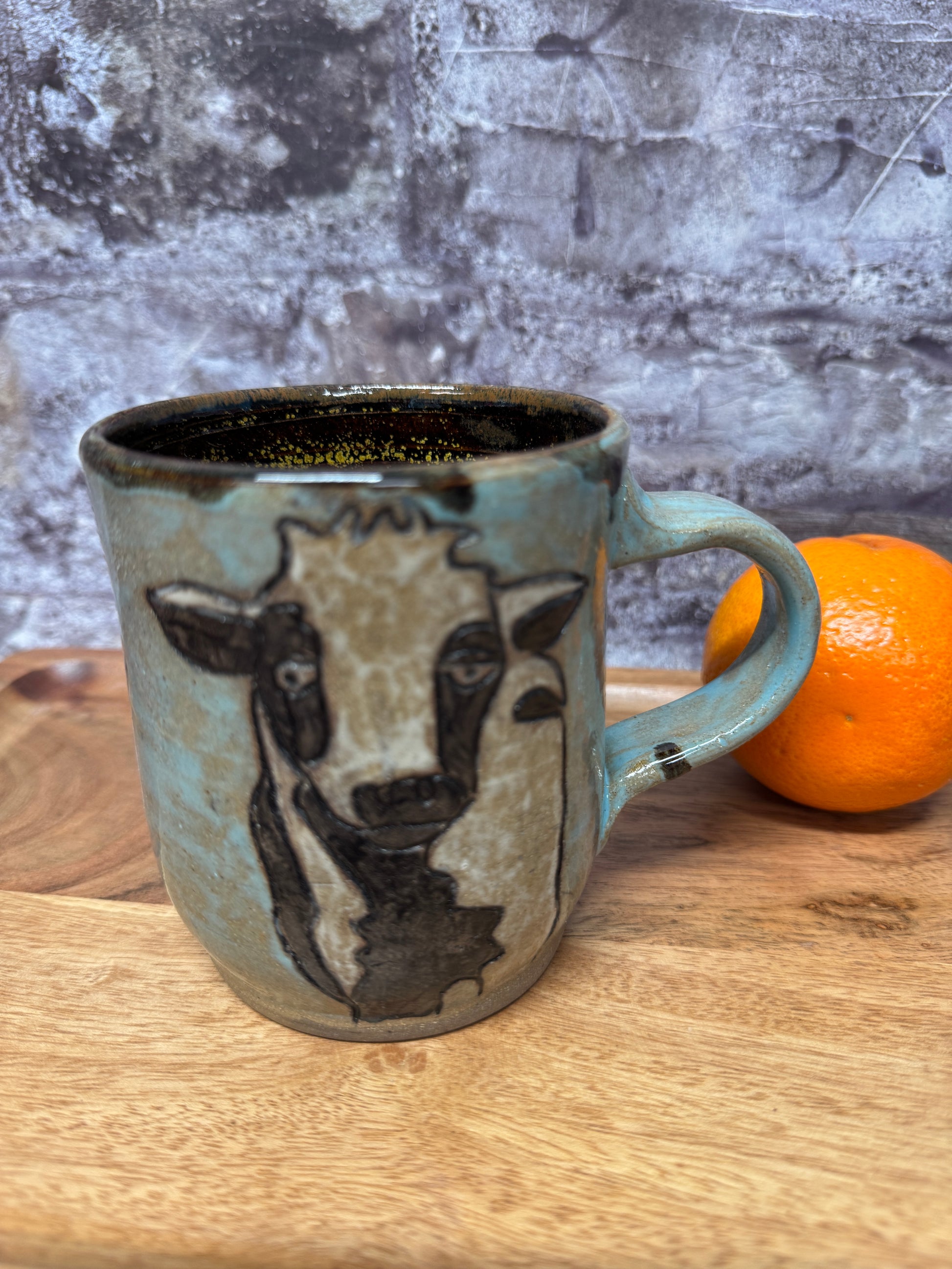 This hand-painted bovine is sure to bring you a peaceful and artful morning. Wheel thrown, and hand-painted she is unique. Dishwasher/microwave safe.