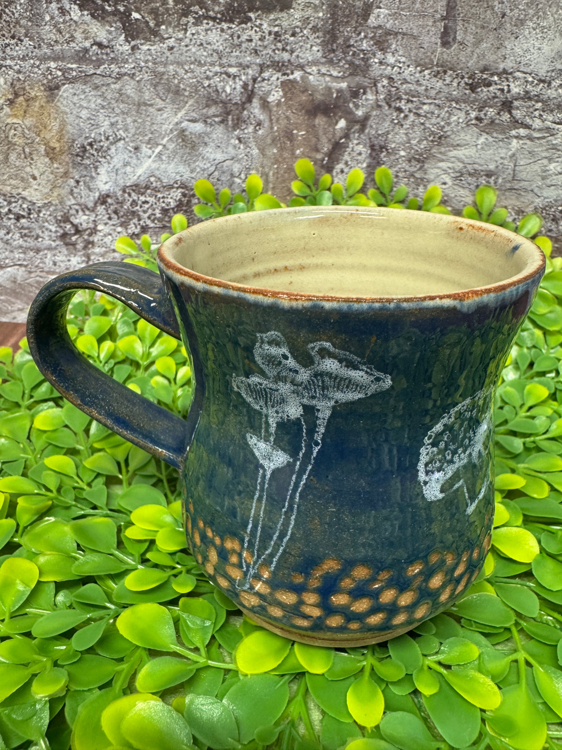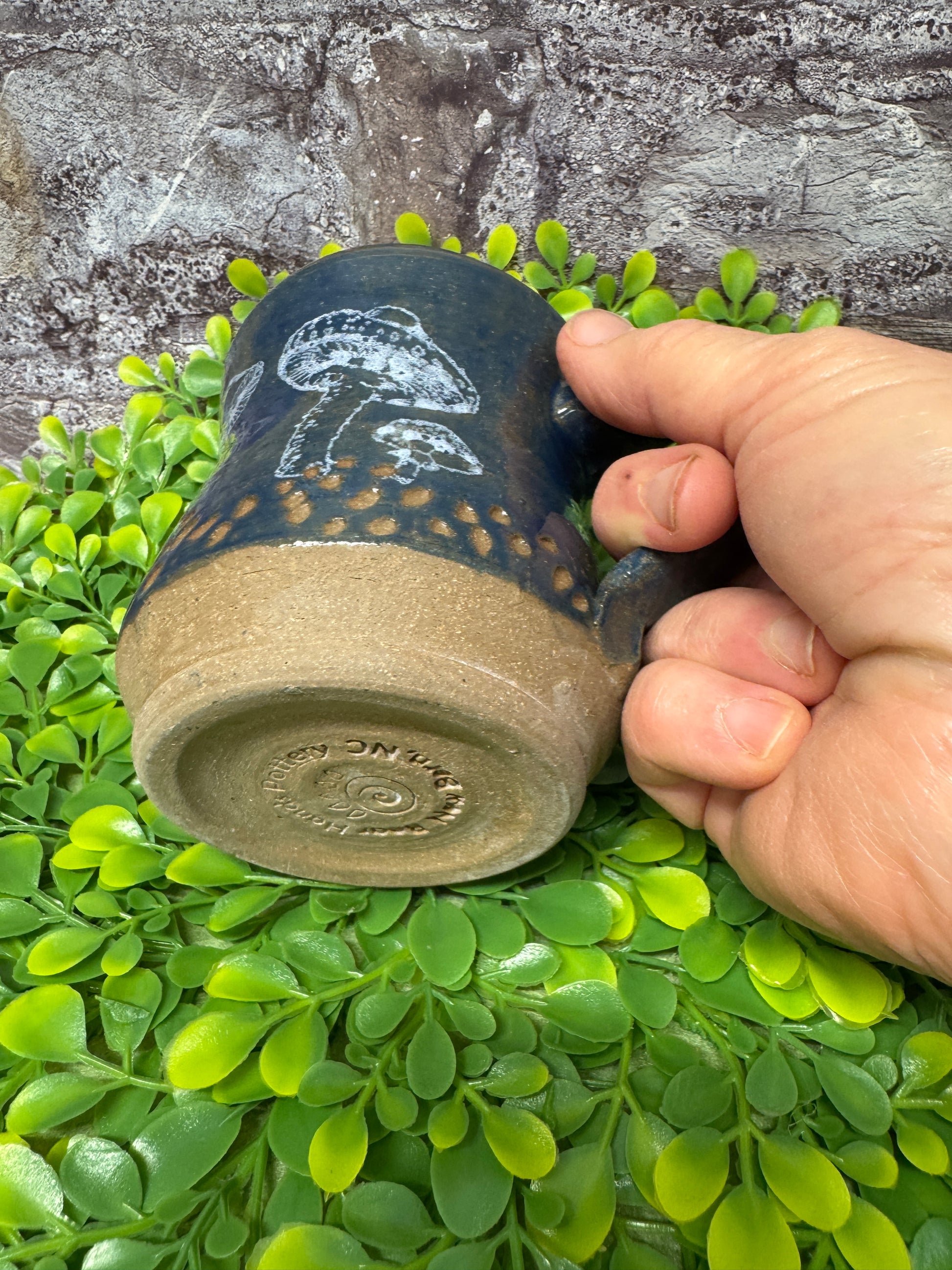 Deep blue glaze with silvery white mushrooms underglaze. Carved earthy speckles and raw clay left unglazed at the bottom. Lined in a rustic creamy white glaze. This moment in the forest is dishwasher and microwave safe.