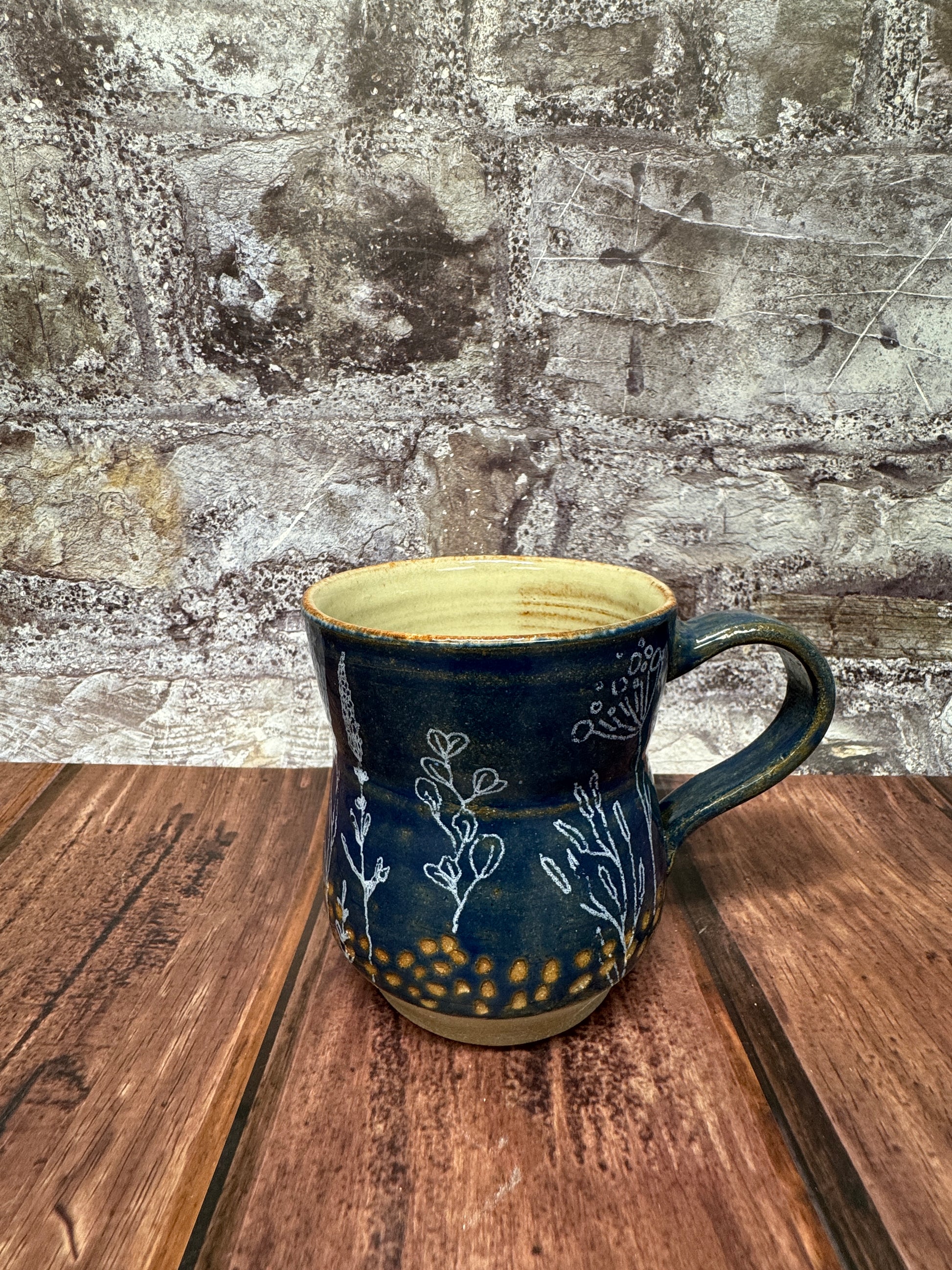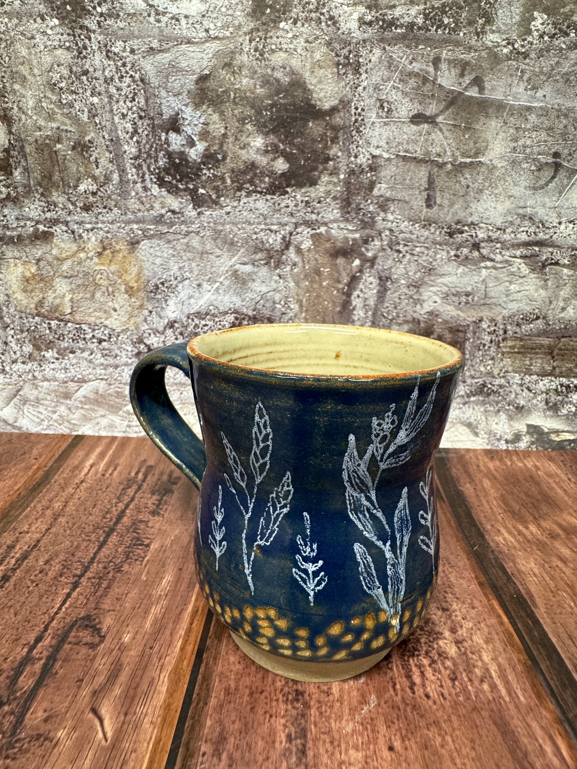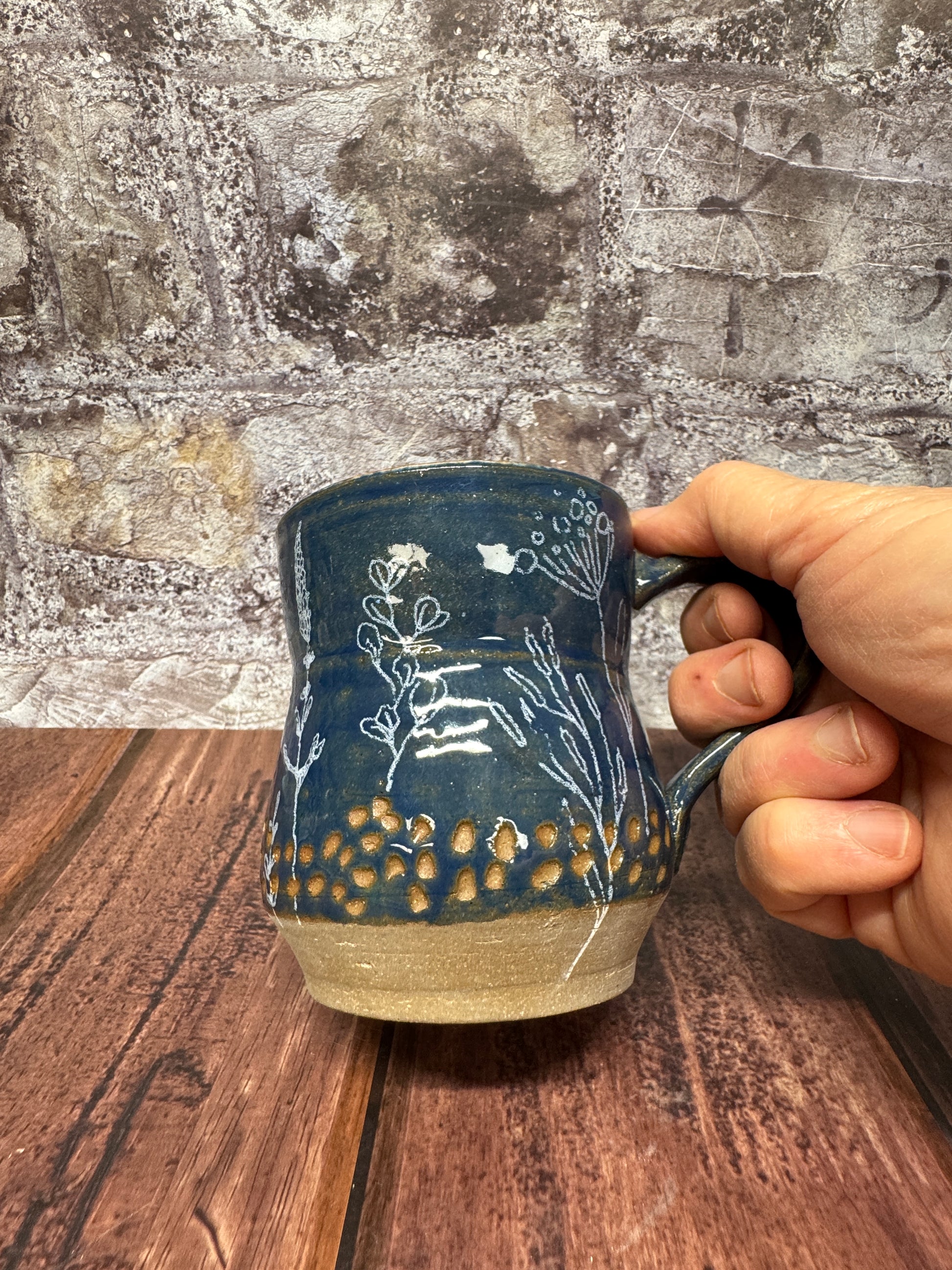 Hand-crafted Botanical Blue Mug, featuring a deep blue glaze and a silvery white botanical print. The rustic design has carved specks near the bottom and a band of unglazed raw clay at the foot. Dishwasher and microwave safe for convenience.