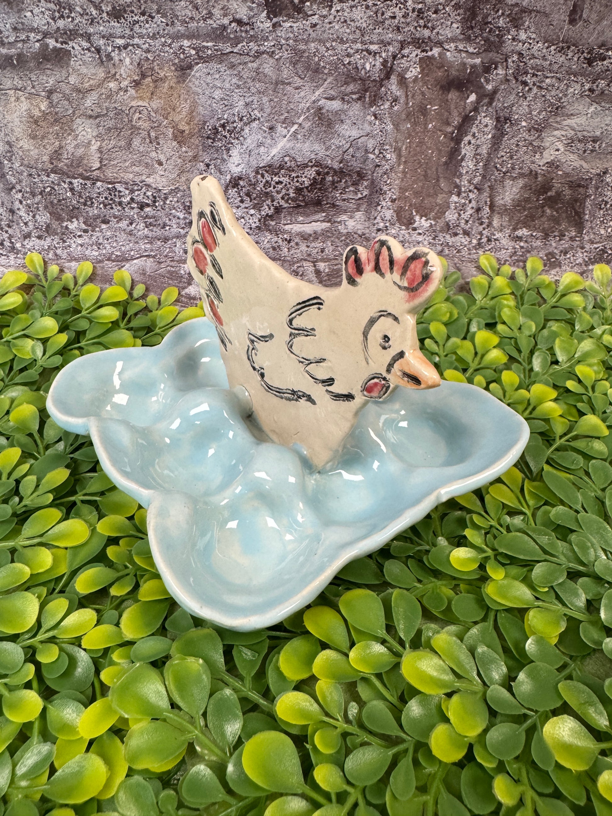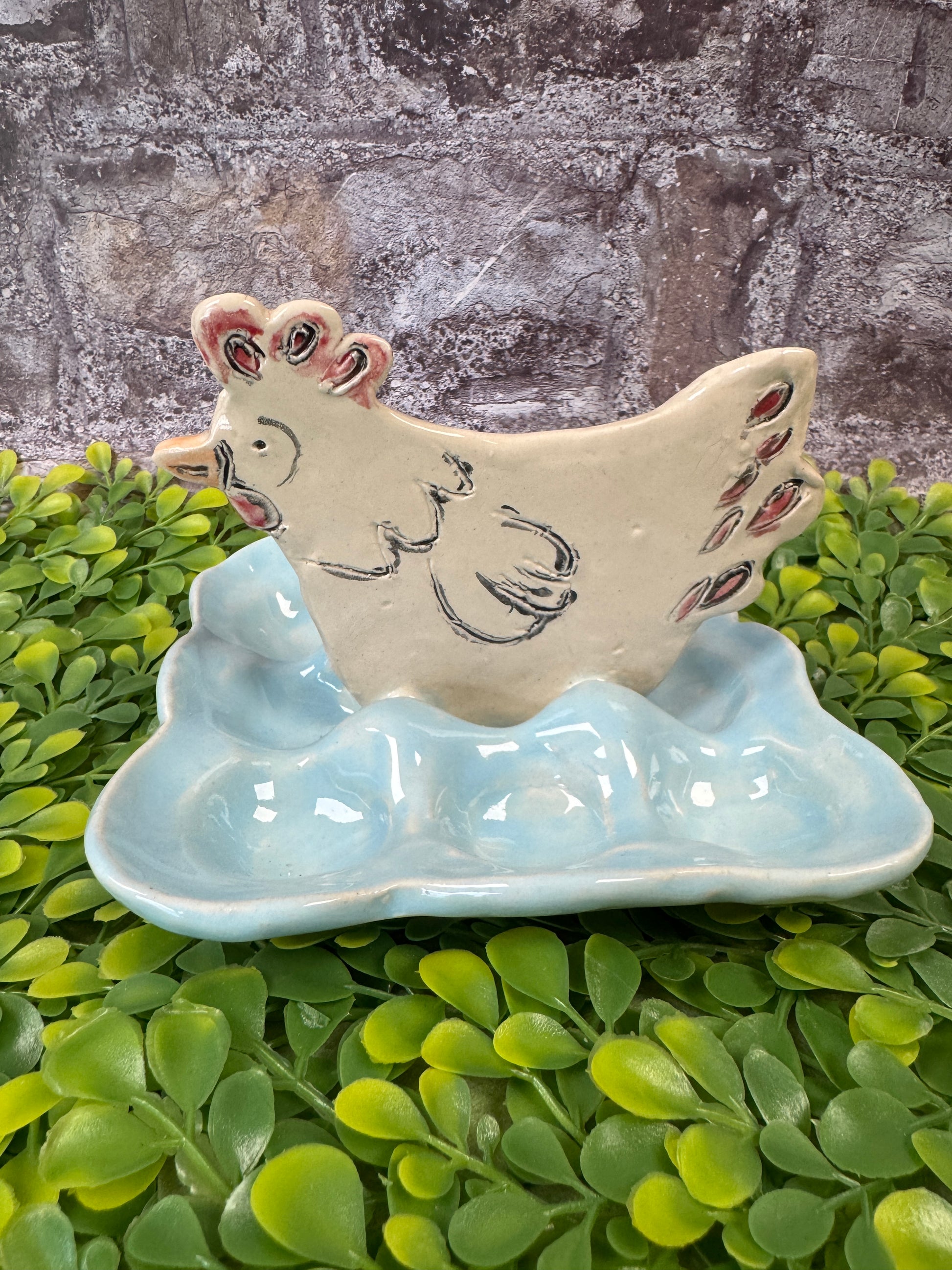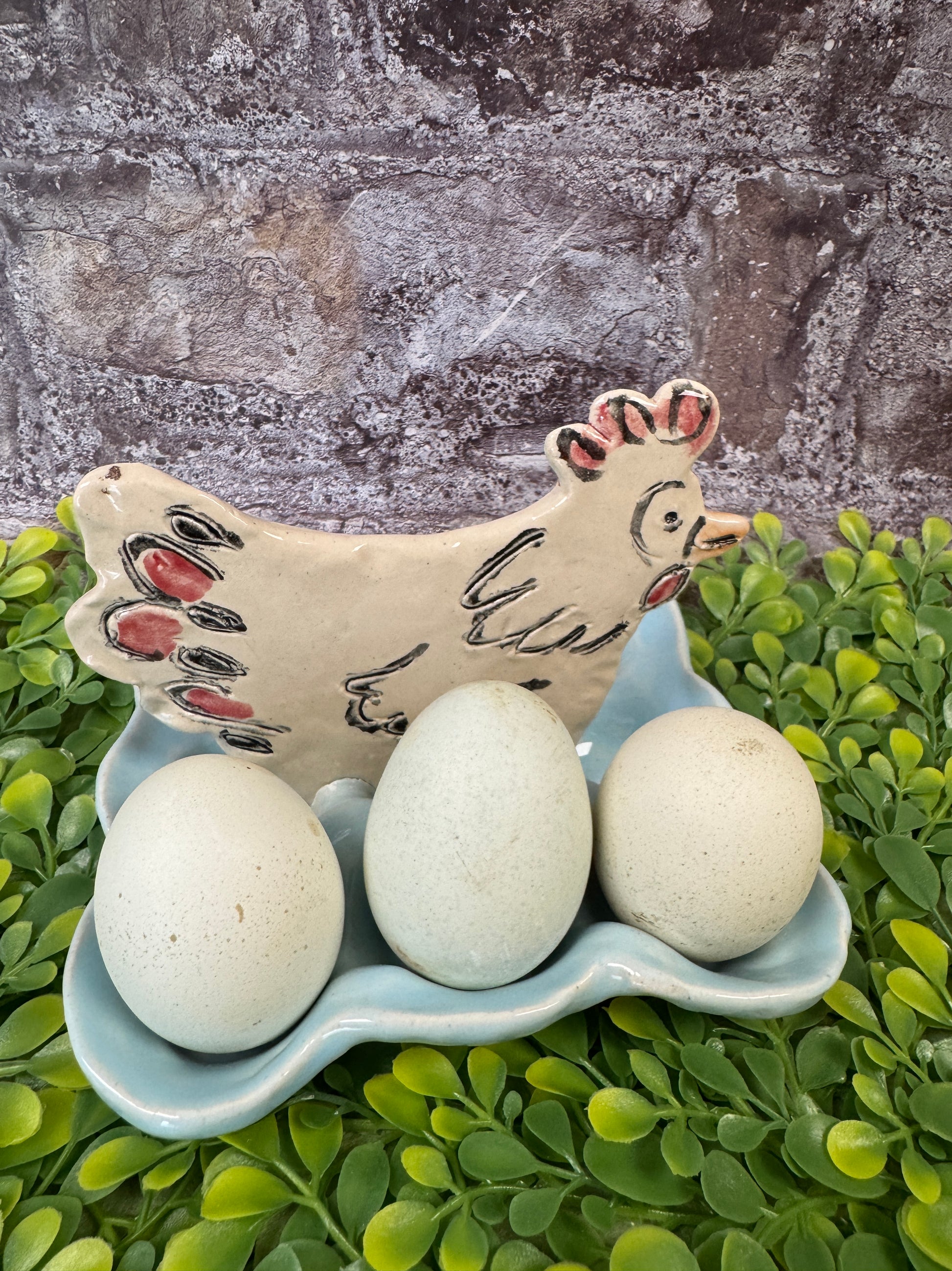 This little tray holds 6 farm-fresh eggs on your counter, for convenience and beauty! The little white chicken handle is hand-painted on both sides.