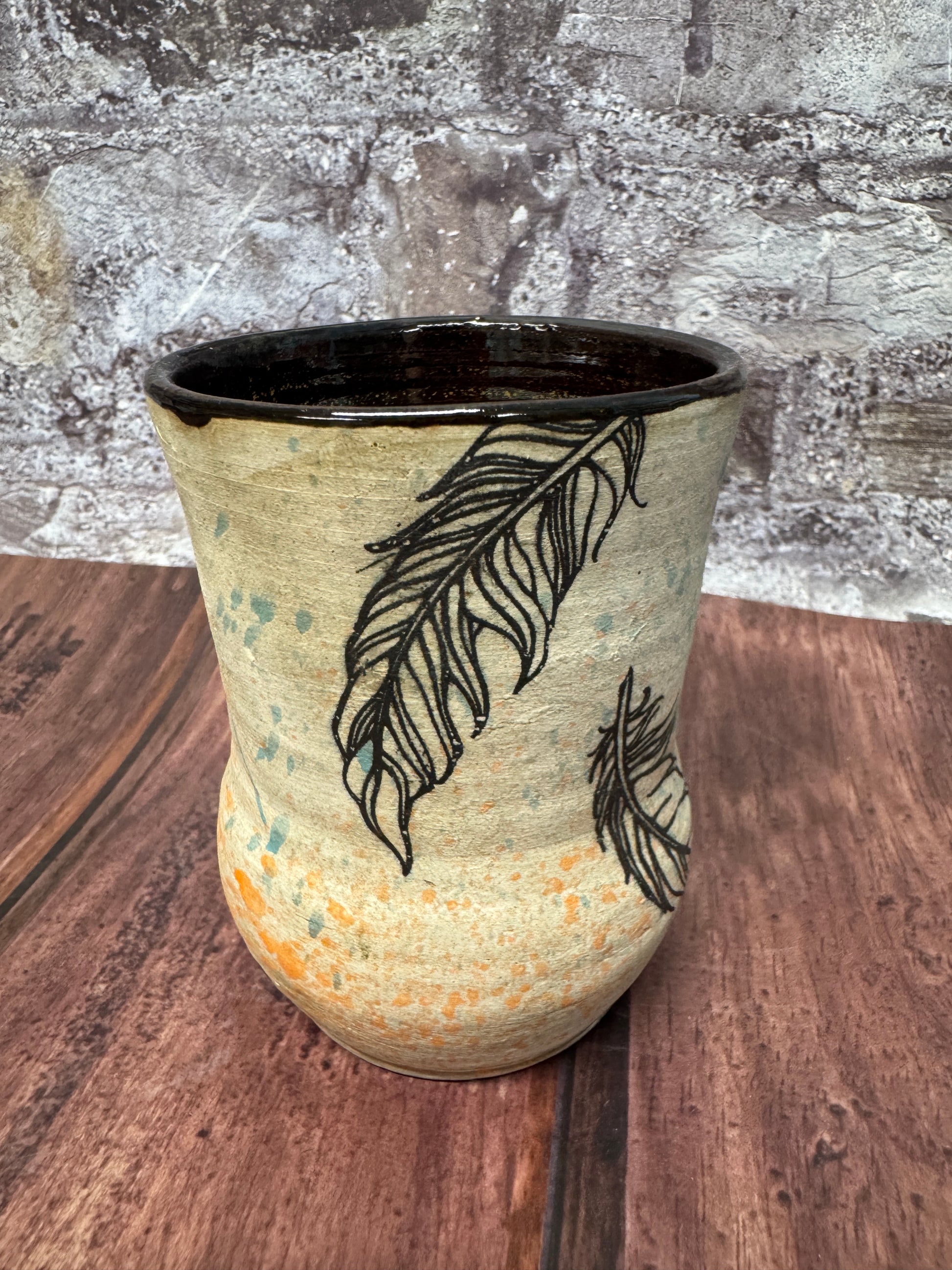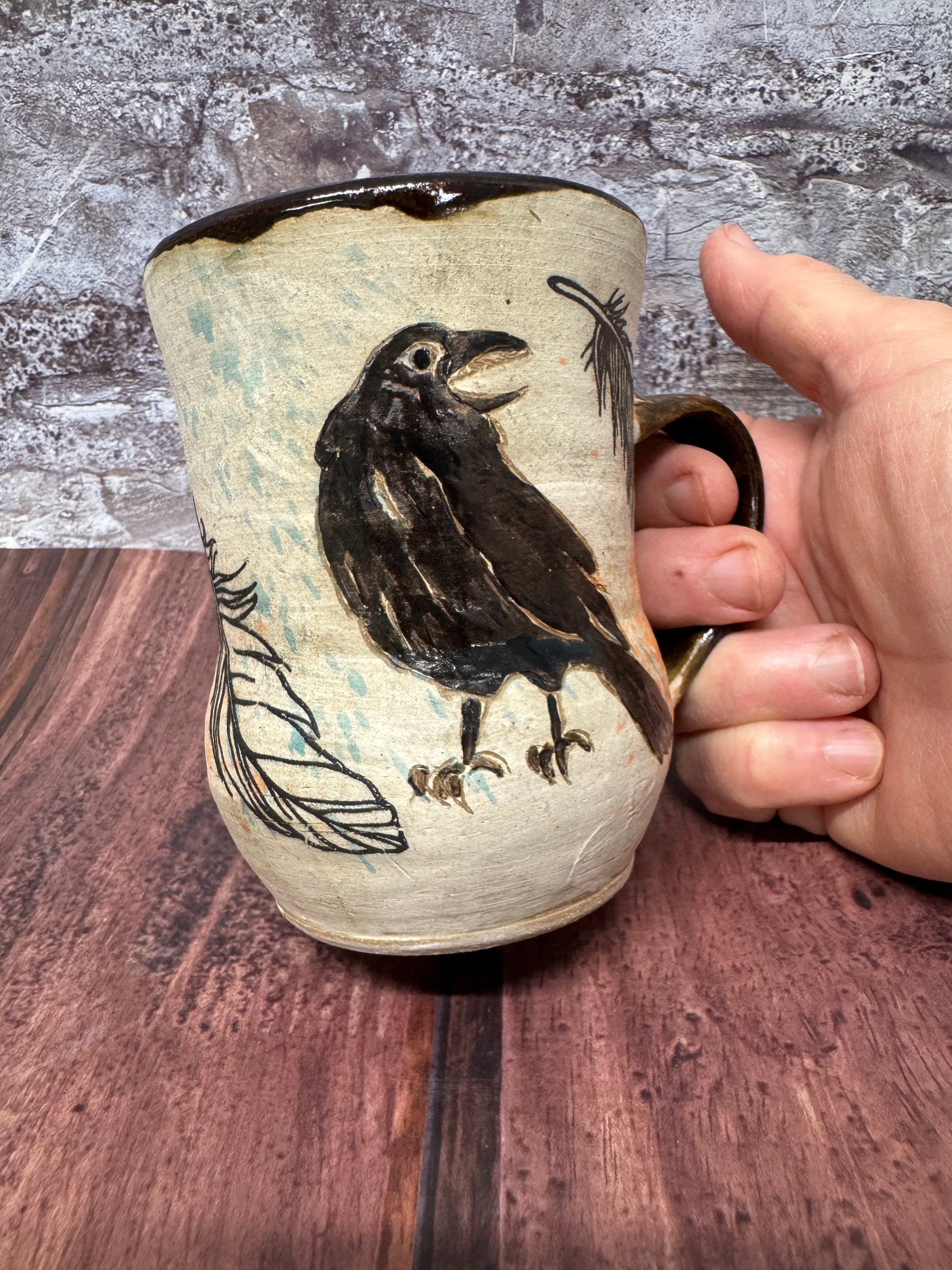 Hand-painted and decorated with underglazes and glazes, this sassy crow has some ruffled feathers. There's a story to each mug, and it's yours to decide. Microwave safe, hand-washing recommended.