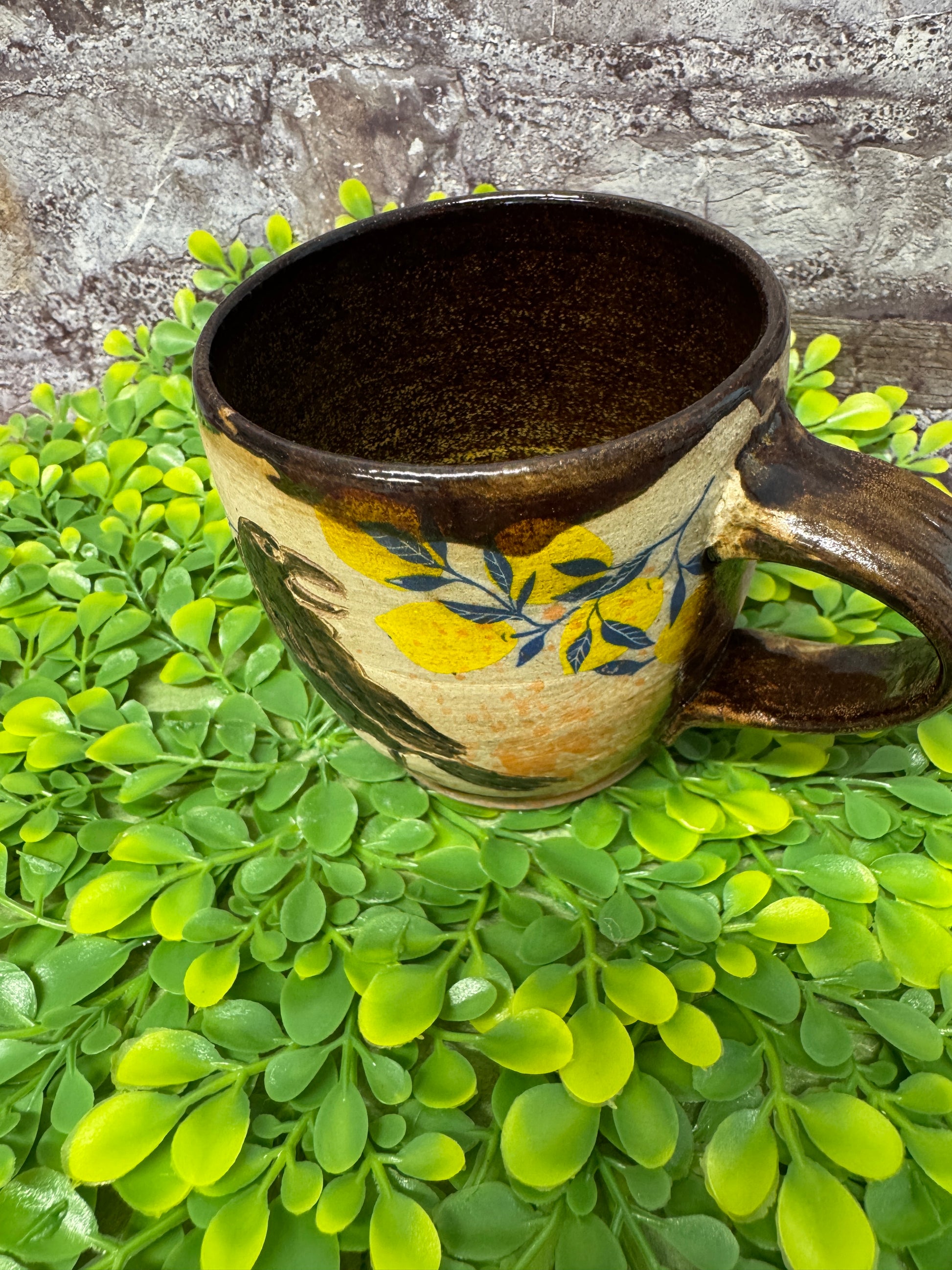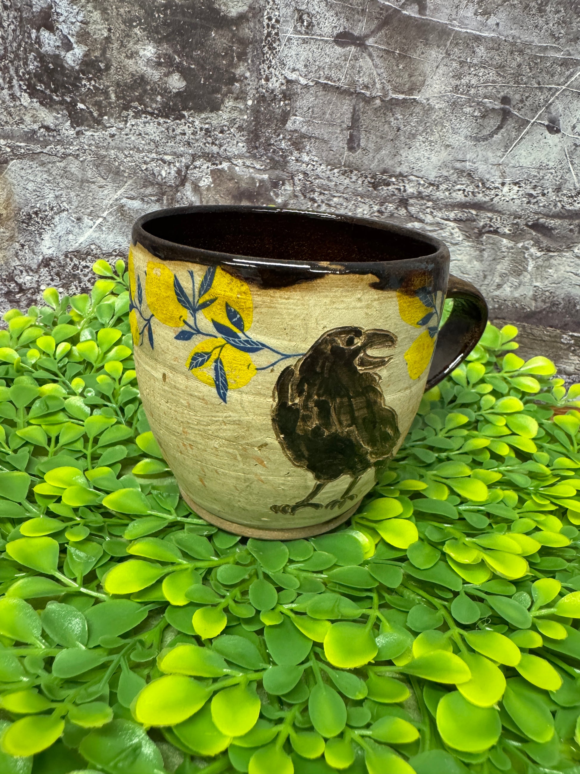 Hand-painted and decorated with bright underglazes and glazes. Is the crow trying to eat a lemon, or simply hiding in the shade waiting for a juicy bug? You decide the story. It's yours alone to tell. Microwave safe, hand-washing recommended.