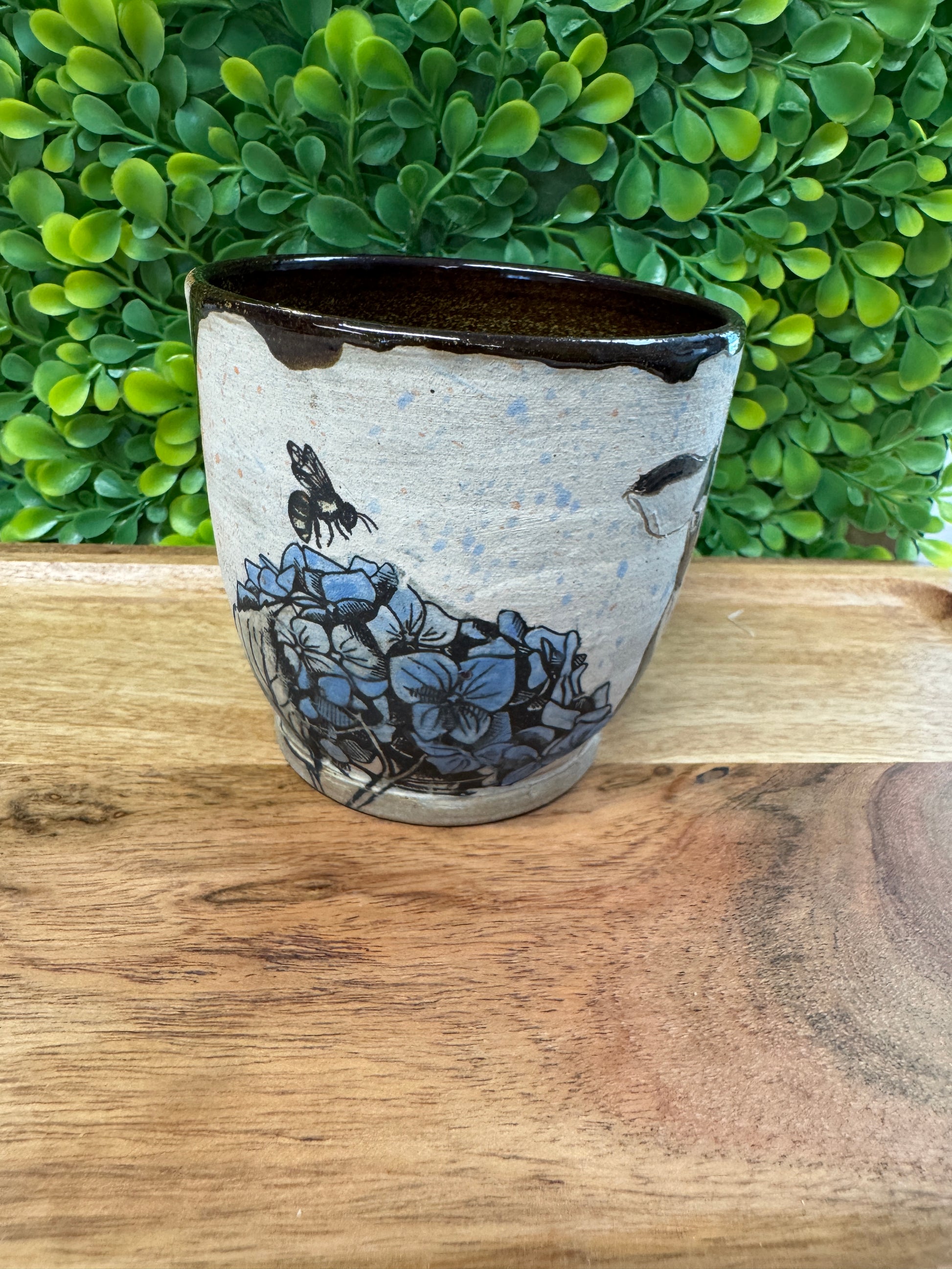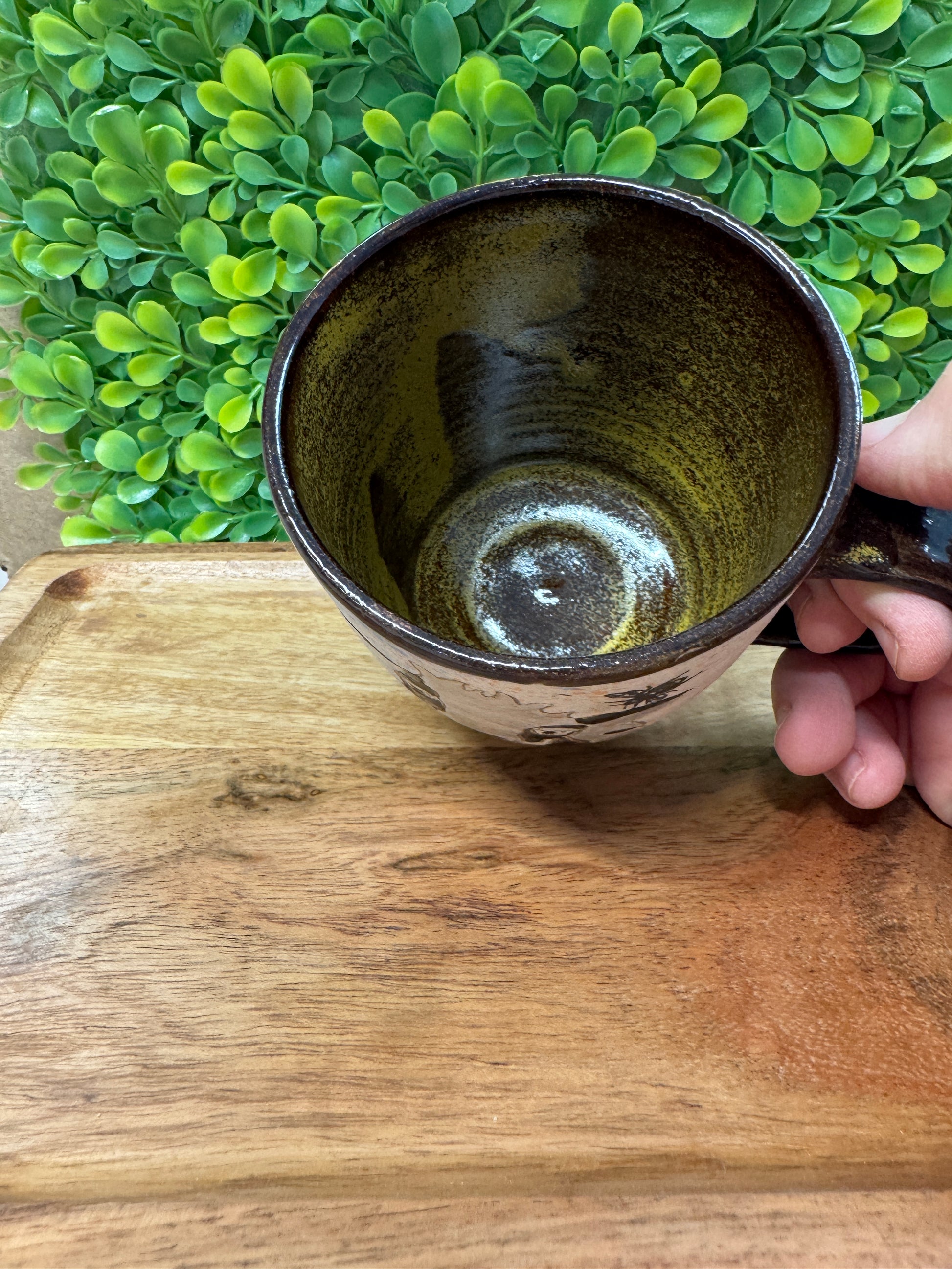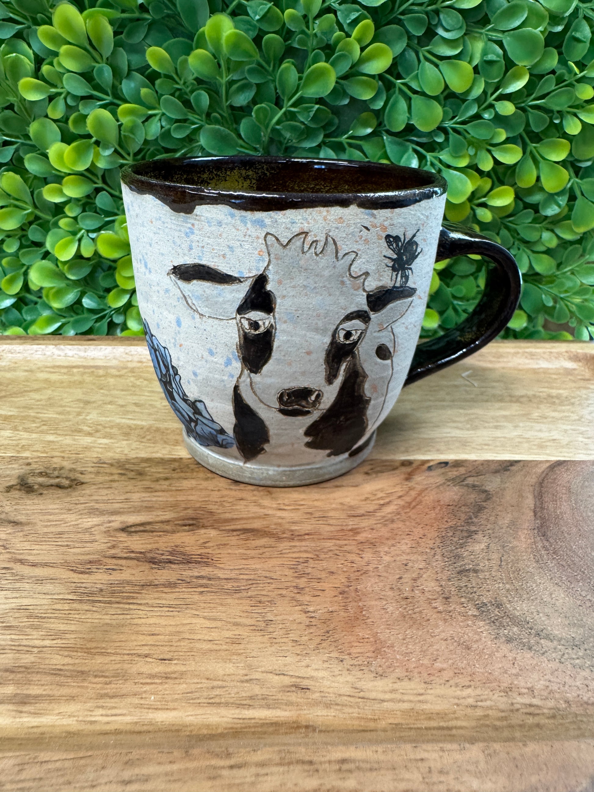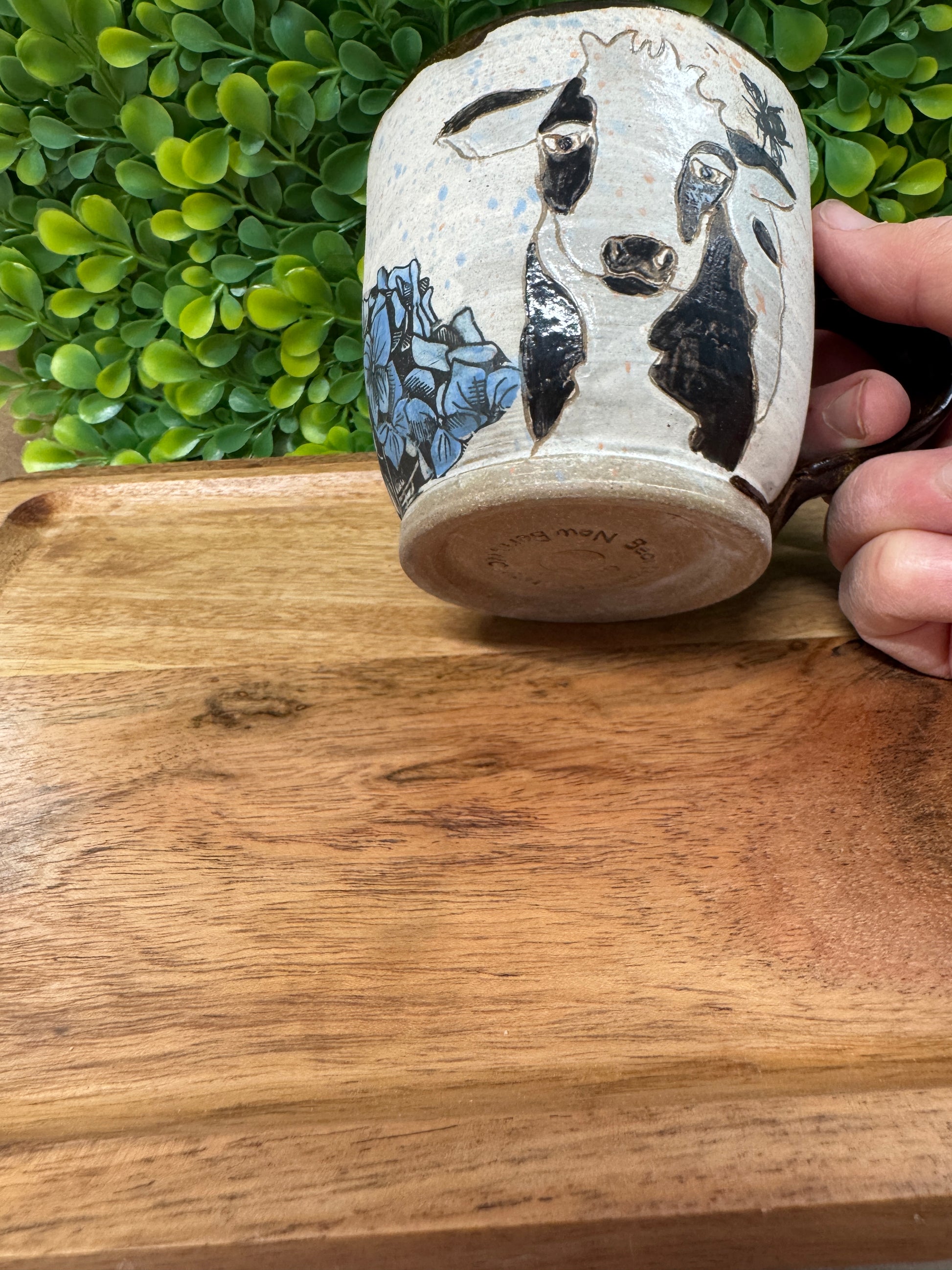 Hand-painted and decorated, this wheel thrown mug features my sweet cow about to munch on the flowers in the pictures. Or make up your own story. Maybe she's hiding? Either way, enjoy your morning cuppa with her. She's yours alone.